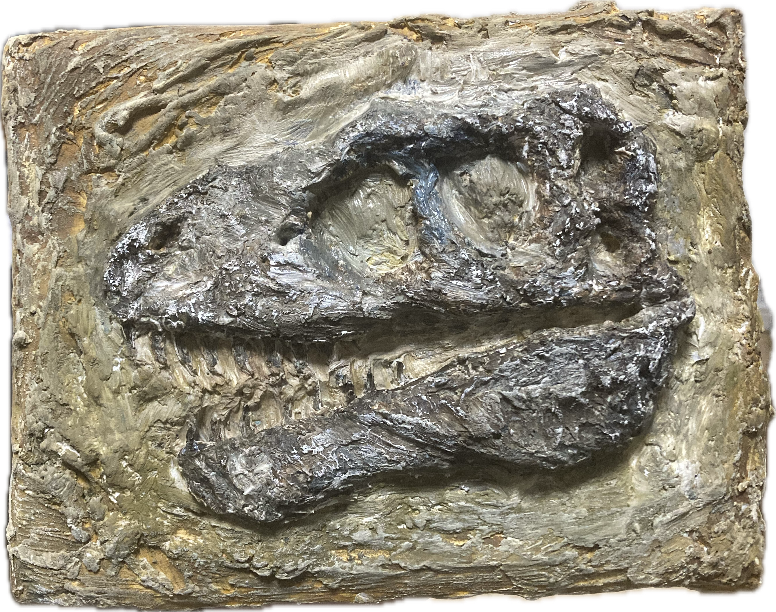 この作品は、ティラノサウルスの骨格を学ぶためにモデリングペースト(盛り剤)で形を作っていたところ、次第に制作に没頭し、そのまま作品として仕上げたものです。